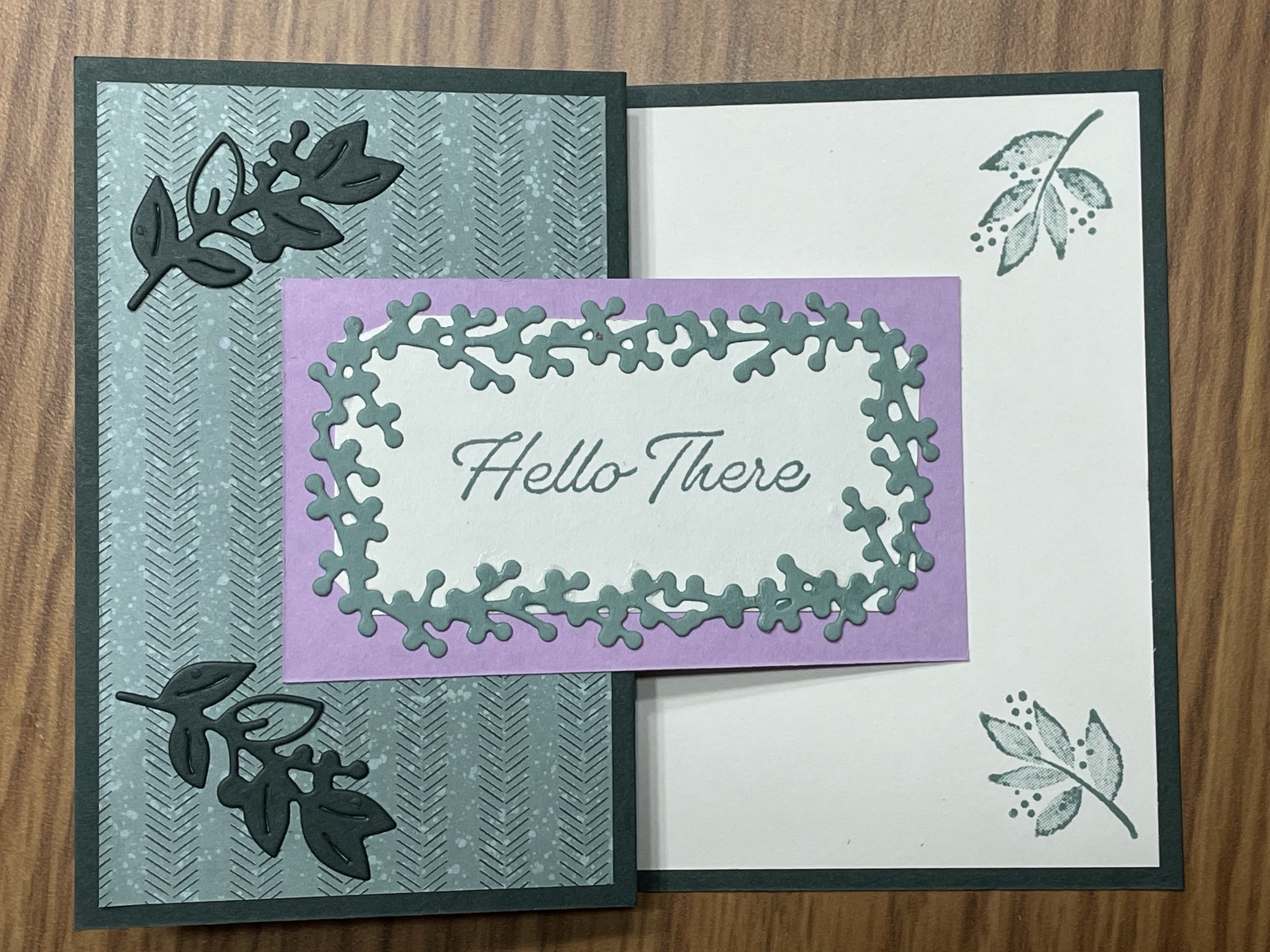 Two simple cards done, I decided to make one more. I still wanted to keep the focus on the paper, so I chose one more pattern to use with two from the previous card. I mounted them on a piece of Pear Pizzazz which I then mounted on a Mossy Meadow card base. I used the same sentiment and punch as well as one In Color Jewel. Like I said before, I love when the DSP does all the work!