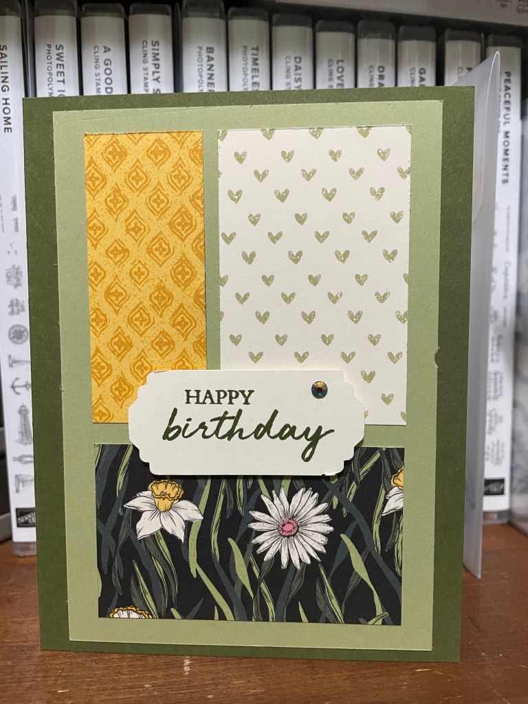 I love it when a Designer Series Paper can do all the work. That is the case with the Daffodil Afternoon 12″ x 12″ Designer Series Paper, available during Sale-a-bration. The first page I selected is perfect for creating card fronts by cutting 4″ x 5 1/4″ pieces. You can get six card fronts from one piece. This will leave you with a 1 1/2″ strip from the middle or 2 – 3/4″ strips from each end, depending on how much blank space you want at the top of the card front. I chose not to have much blank space and instead let the image fill the card front. All I had to do was stamp a sentiment on Very Vanilla and punch it out with the Lovely Labels Pick a Punch. I added a 2021-2023 In Color Jewel and mounted it on a Crushed Curry card base. Voila! The card is done.