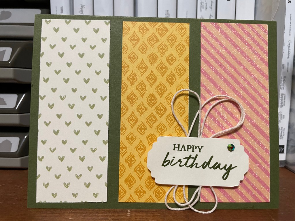 I realized that I couldn’t stop there. The patterns on this paper were so fun and varied. Besides, I had a strip of 1 1/2″ DSP left over that was just begging to be used. I cut it into 4″ pieces and then chose two more pages to also cut in 1 1/2″ x 4″ strips. I mounted the three strips on a Mossy Meadow card base. I then stamped a sentiment from Shaded Summer stamp set in Mossy Meadow ink on a piece of Very Vanilla and punched it out with the Lovely Labels Pick a Punch. I added an In Color Jewel and some Very Vanilla twine and Voila! – the card was done.