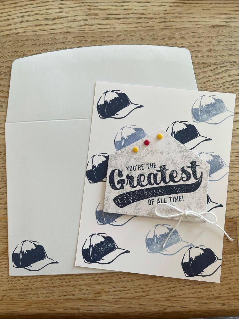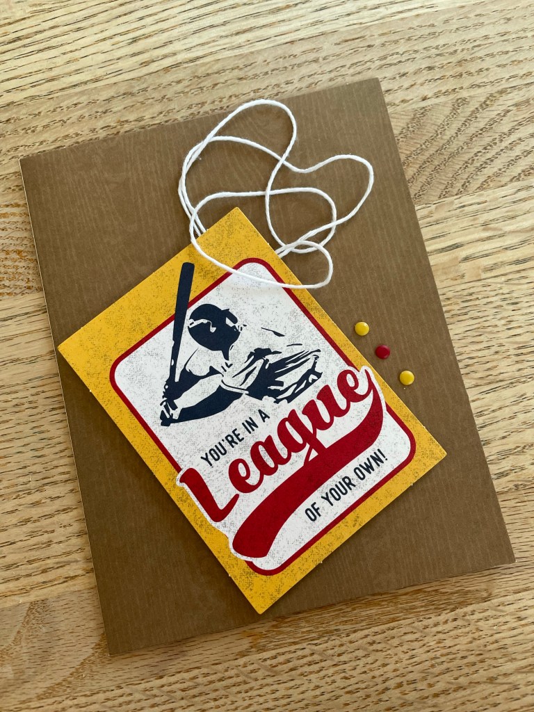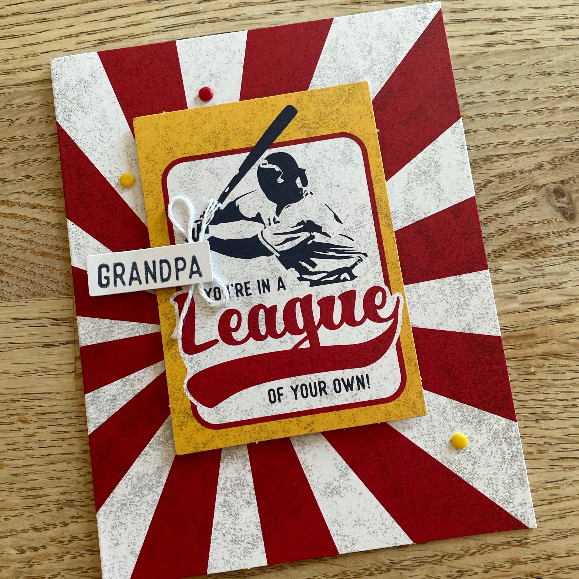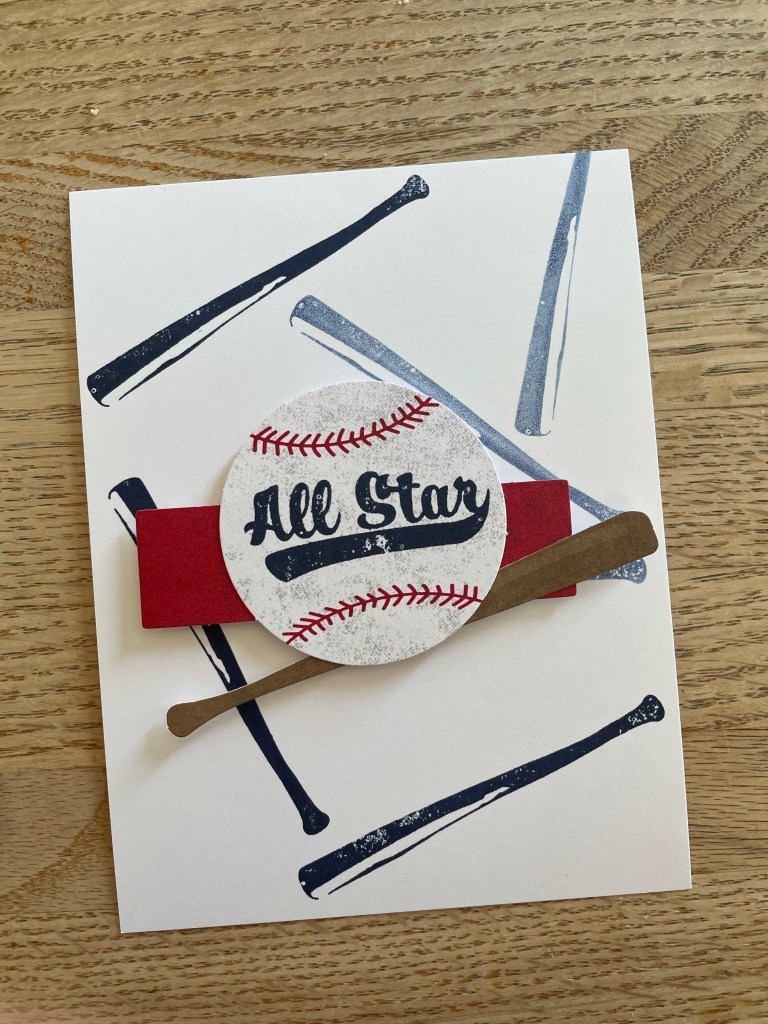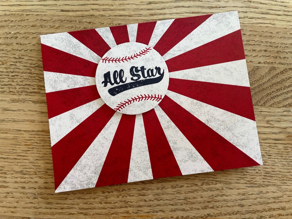 The June Paper Pumpkin was a stretch for me. I am not a baseball fan. I started by creating one each of the predesigned cards. I was tired, it was the end of the week so that was as far as I got.