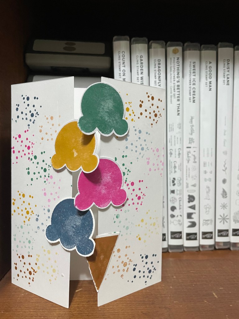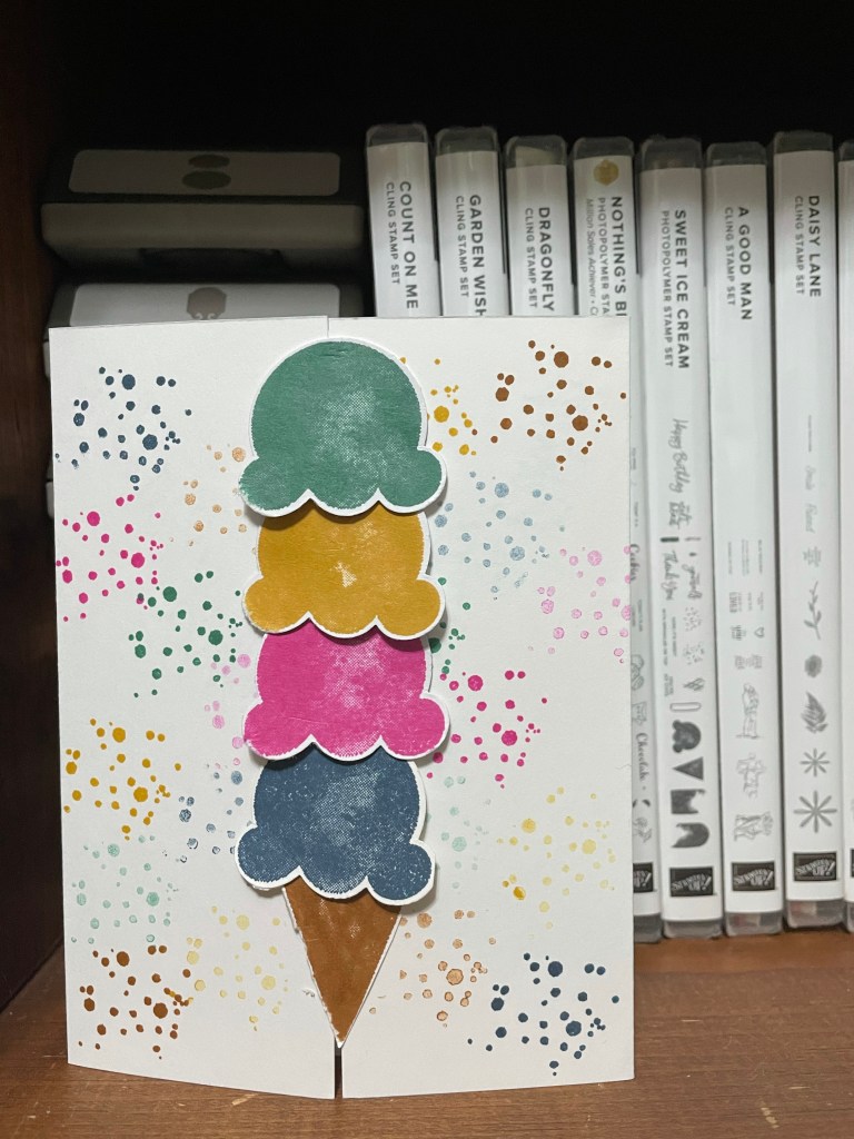 I hope you will try this card for yourself. It only used a card base of Basic White 5 1/2” x 8 1/2” and scraps for the scoops and cone. I scored on the long side at 2 1/8” at each end. Rather than use Designer Series Paper, I used one of the stamps to create the spots, once again using all the In Colors. I stamped once full strength and then again without reinking. This allowed for light and dark versions of each color. The products are listed below.