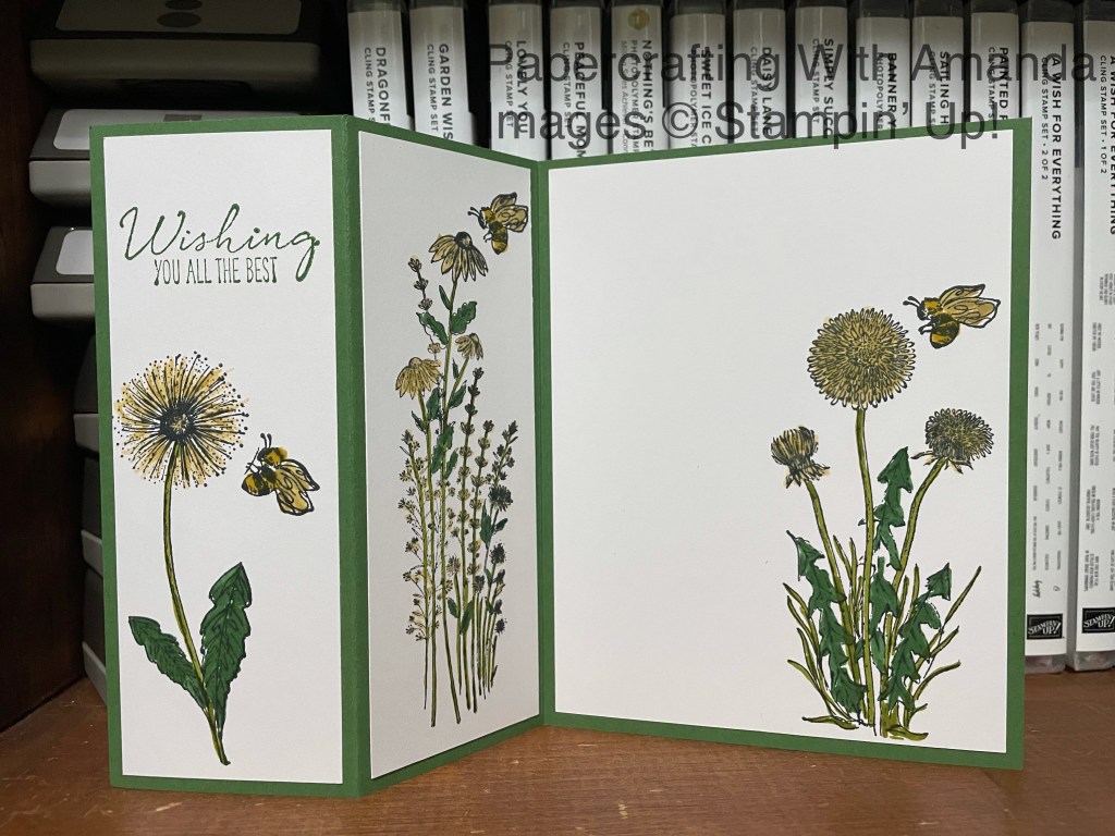 When I saw the theme of garden, my mind immediately went to the Garden Wishes stamp set and Dragonfly Garden stamp set from Stampin’ Up!. I realize that there is the obvious connection of the word garden in the title of both stamp sets. In reality, it was the images of wildflowers and insects that attracted me. I am not a gardener. I don’t like the idea of having to plant annuals year after year. Besides I don’t like dirt under my finger nails and I am allergic to several types of pollen. That said, I like the beauty of wildflowers and what many people consider weeds. Dandelions sprout where they want, spread where they want, and have several different looks. Bees and other insects are such an important and underappreciated part of a garden. Don’t get me wrong, there are other creatures I like more than bees and dragonflies, but I appreciate the important role they play and let them do their thing.