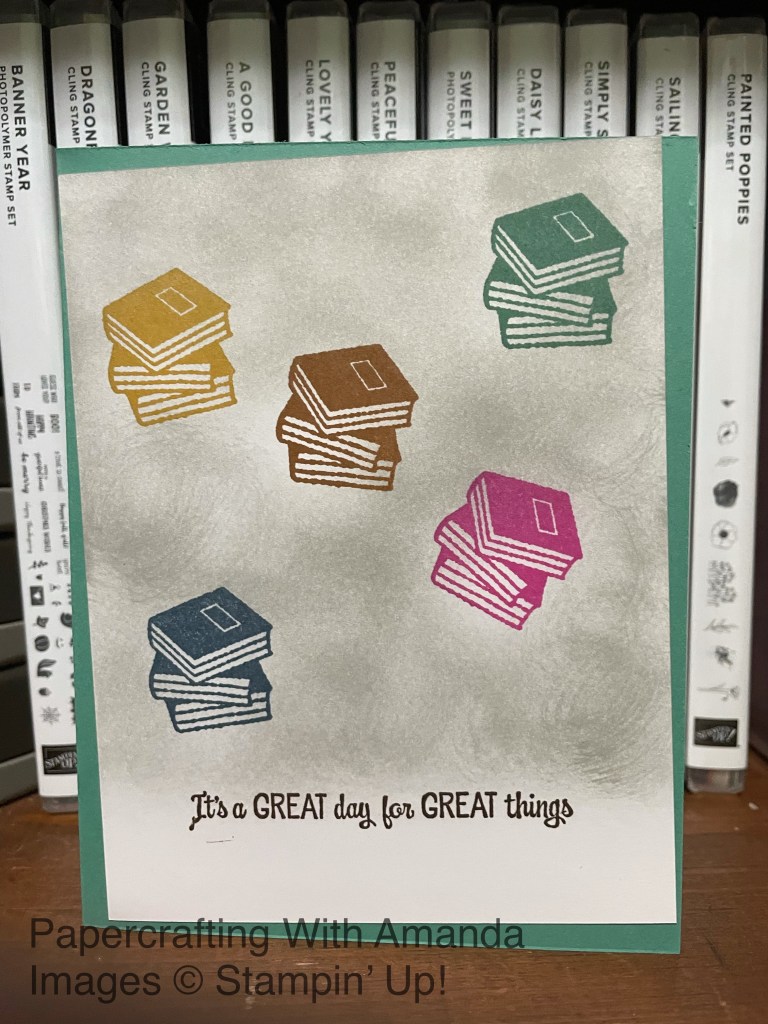 Once I got started it is hard to stop papercrafting. Next I decided to make a card with lots of books. This card features the 2020-2022 In Colors along with a sentiment from Make It Happen stamp set.