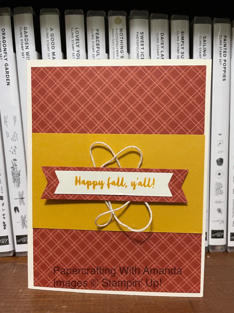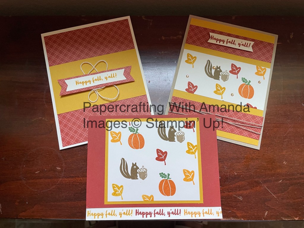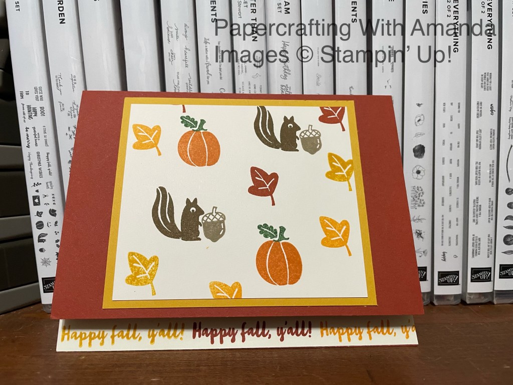 Really, I should say cards because I actually made three. I decided to use the Banner Year stamp set because of the cute little fall images and as someone who has lived in the south since the age of seven, I couldn’t resist the sentiment. “Happy Fall, Y’all!” I began with a 4″ x 5 1/4″ piece of Very Vanilla cardstock and stamped the cute fall images to create my own patterned paper. I used soft Suede for the squirrel, Crumb Cake for the acorn, Pumpkin Pie for the pumpkin, Garden Green for the pumpkin stem, and Mango Melody, Cajun Craze, and Crushed Curry for the leaves. When I pulled out a piece of scored Cajun Craze cardstock that I thought was already cut as a card base, I discovered it was only 8″ x 5 1/2″ so the front was 1/2″ smaller. Rather than get a new sheet of cardstock, I decided to attach a strip along the bottom with the sentiment repeated in Crushed Curry, Cajun Craze, and Mango Melody. I then cut the patterned piece to 3 1/4″ x 3 3/4″ and added a piece of 3 1/2″ x 4″ Crushed Curry. Simple and easy!
