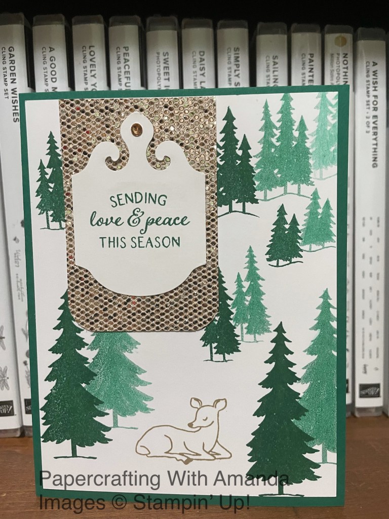 The stamped images are from the Peaceful Deer stamp set in the July to December 2021 Mini Catalog. Shaded Spruce seemed like the natural choice for the trees and I continued the color scheme for the card base and sentiment. I stamped off the trees once to create the illusion of depth. This card also features the Elegant Tag punch from the 2021-2022 Annual Catalog. And the sparkly paper? The Be Dazzling 6×6 Specialty Paper is free with a $50 purchase during Sale-a-bration in August and September.
