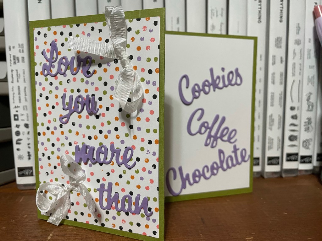 I took a look at the dots on the DSP and realized that it didn’t have to be Halloween. So, I put together another gift cold holder using the words from the “Love You More Than” dies. I pulled out one of the colors from the DSP – Highland Heather – and added a few bows out of Crinkled Seam Binding Ribbon. This was perfect to send to my daughter and she will never know that I used Halloween Paper. (Unless she actually reads my blog post!)